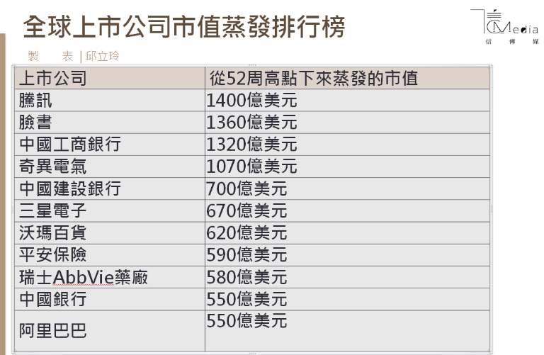 臉書跟騰訊一年以來總共跌掉接近3000億美元的市值,這個金額已經相當於菲律賓一年的GDP總量。