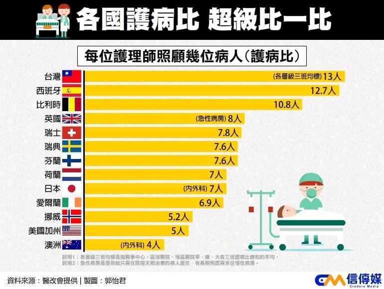 台灣醫護人力評鑑標準相較其他國家偏低,每床的配備標準跟美國相比,醫師為美國的4分之一,護理師為2分之一,藥師為8分之一至17分之一。(詳見「各國醫護比比較表」)。除此之外,對於檢驗、放射、麻醉、呼吸治療等專業,長期皆處於人力不足的情形,衛福部不但沒有立法保障,反而要將最後一道防線撤除。根據醫改會調查,台灣護病比為1:13,這樣的數據已遠高於其他已開發國家,但仍有基層護理人員指出,數據其實是假的,實際走一遭就知道,白天班至少1:20,大夜班至少1:30。
