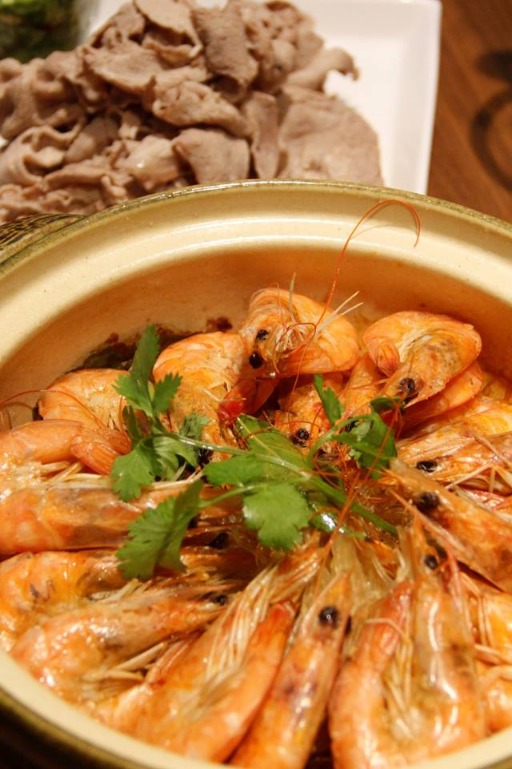 4.砂鍋加油加熱,小火炒香蒜末、檸檬葉、南薑(檸檬葉、南薑可省略),蝦子放入鍋中煎香。