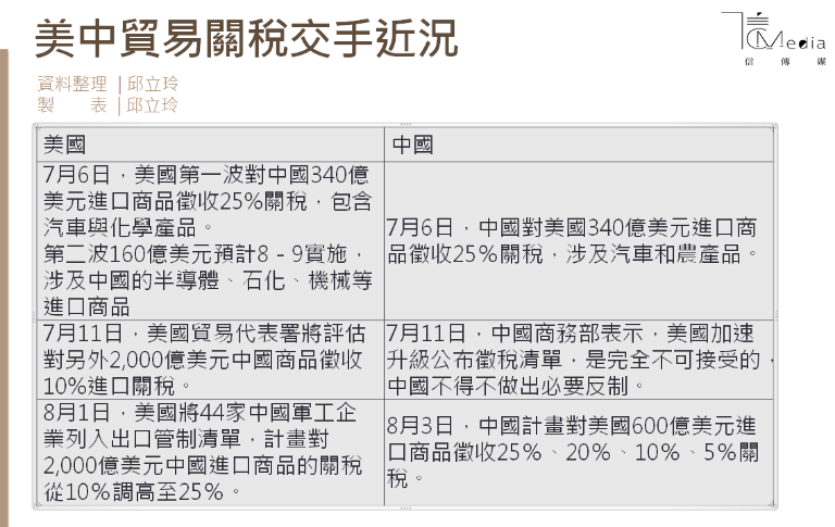 8月3日晚間中國國務院關稅稅則委員會公告稱,決定準備對美國的約600億美元商品徵收5%-25%不等的關稅,主要是針對5,207個稅目的美國商品徵收關稅。從這則消息來看,中國短期無意跟美國談和,有意跟美國打持久戰,反正中國領導人也不在乎陸股、人民幣跌到趴,而且習近平是萬年國家主席,沒有任期限制,無須討好選民,川普不可能一直當總統,中國可以跟美國耗下去。