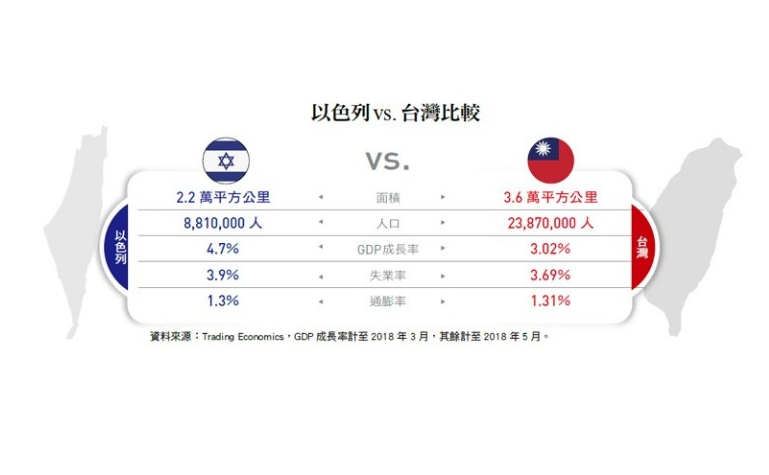 以色列與台灣雖然有8,000多公里之遙,但其與台灣卻有許多相近之處:兩者的內需市場都小、都位處相當艱困的地緣政治環境、資源匱乏等,但卻也因此,都孕育了許多知名的高科技企業。不同的是,台灣以科技硬體見長,以色列則擅長軟體,尤其是網路資安等領域。