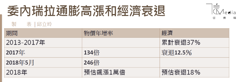 從物價狂飆和經濟衰退可知,近幾年在馬杜羅領導下陷入嚴重的經濟危機,民眾缺少食品和醫藥,嬰幼兒死亡率大幅攀升。不幸的是,委國民眾的苦日子還沒完,據國際貨幣基金(IMF)估計,今年底前物價將狂飆1萬倍,今年GDP將衰退18%,此種物價漲幅,令人想起2008年辛巴威物價飆2.2萬倍、德國一戰後物價曾在每49小時漲一倍,至於國民黨統治下1947年上海米價漲幅20倍,算是小巫見大巫。