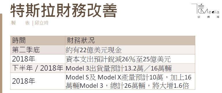 其實,特斯拉財報確實不好看,1日公佈第二季虧損超過 7.1 億美元,每股虧損 3.06美元,創下虧損新紀錄,但市場認為其營運結構好轉,今年6月大裁9%的員工後第二季營收年增43%,加上Model 3周產量將增至6000輛,使馬斯克相信第3、4季有望賺錢,加上特斯拉在研發迷你電動車,瞄準低價市場,這一連串的利多股價一路高奏凱歌到現在。