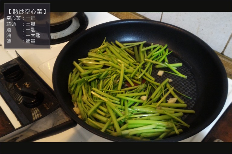 小記:空心菜是需要快炒的菜,要炒得翠綠,烹調時間要短,理想要在30秒內完成炒菜的程序,加入高湯可以減緩直火加熱的溫度,可以分次加高湯作調整,菜中的膠質微微帶出來。空心菜梗拿來炒肉絲或豆乾都是很好的下飯菜。
