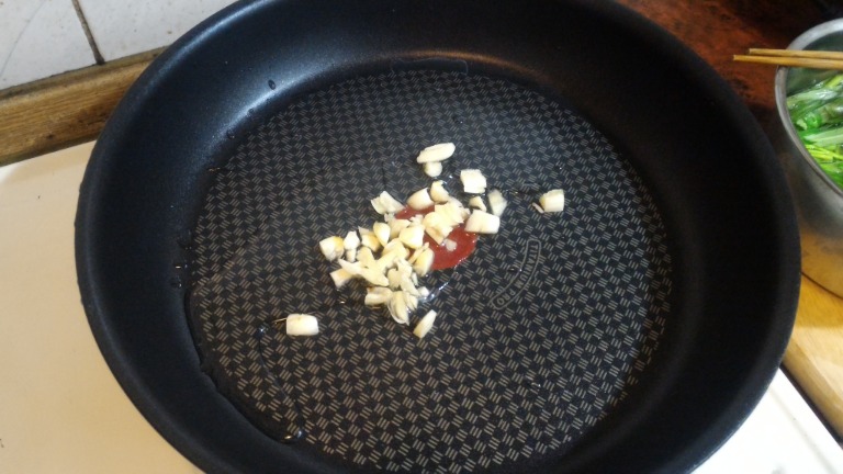 2.蒜頭切末,燒鍋熱油爆香。