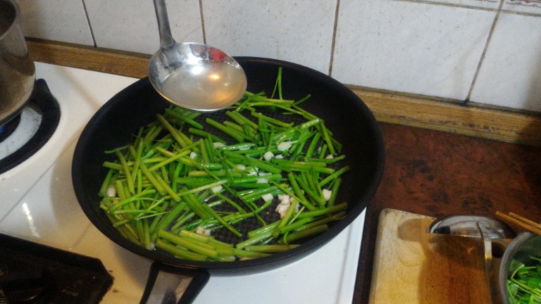 4.下空心菜葉翻炒,加一匙酒翻炒。