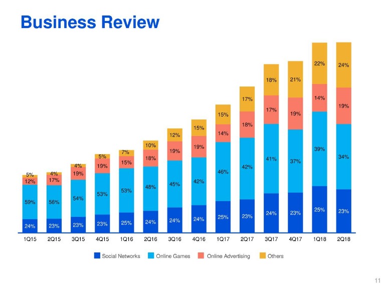 在增值服務兩大區塊裡,網絡遊戲營收為252億人民幣,社交網絡營收為168.67億人民幣。值得注意的是在騰訊的手遊部份(包括在網路遊戲裡),第二季營收為176億元人民幣,雖然比去年同期增長19%,不過卻比上季下滑了19%。電腦遊戲下滑更為明顯,營收比去年同期以及上季呈現5%及8%的下滑幅度。