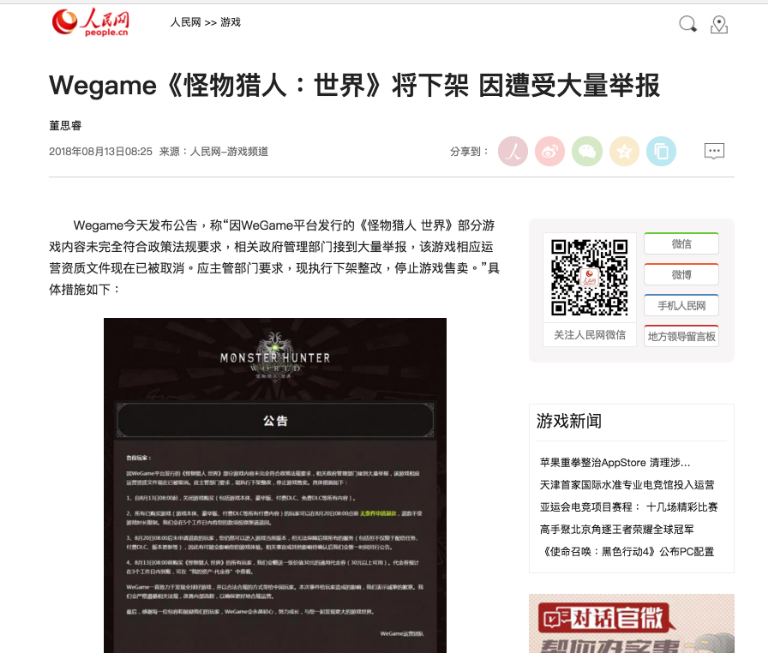 目前在全球大賣而由騰訊代理的《絕地求生:刺激戰場》(吃雞手遊)因為還未獲得遊戲版號,所以無法盈利(monetization)。更糟的是,騰訊在一個月前在其WeGame平台推出的《魔物獵人 世界》,雖然獲得了版號卻在本月13日無預警下線,根據公告內容是因為「相關政府管理部門收到大量舉報,相關遊戲營運資質現已被取消。」