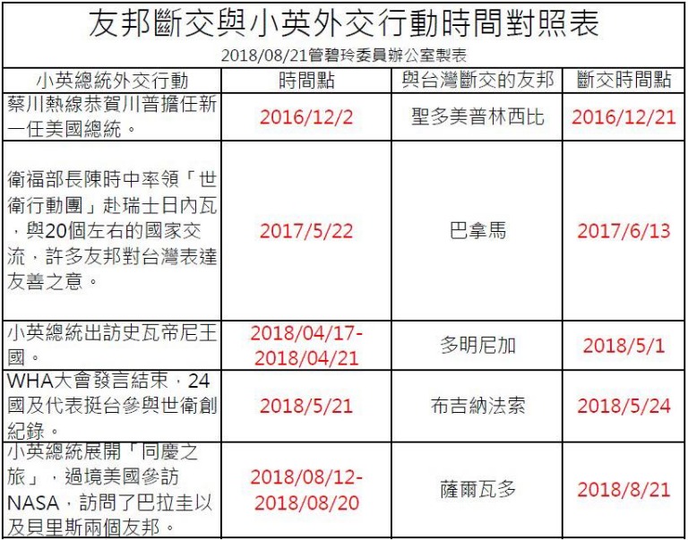 民進黨立委管碧玲整理資料發現,2016年12月2日川蔡熱線後,同月就發生聖多美普林西比與我國斷交,接著從巴拿馬、多明尼加、布吉納法索到薩爾瓦多斷交,斷交發生的時間點不是剛好在總統蔡英文出訪結束後,要不就是在台灣進行國際參與相關行動之後,很顯然地,發生斷交都不是偶然。