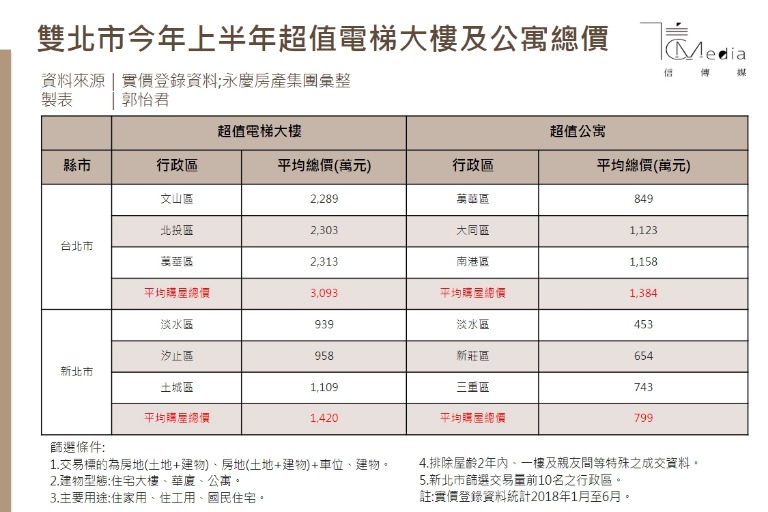 根據今年一到六月實價登錄資料,永慶房屋統計出雙北市各行政區電梯大樓及公寓的平均總價,發現台北市電梯大樓以文山區的平均總價最超值,公寓則首選萬華區;新北市的電梯大樓、公寓,都以淡水區最便宜。