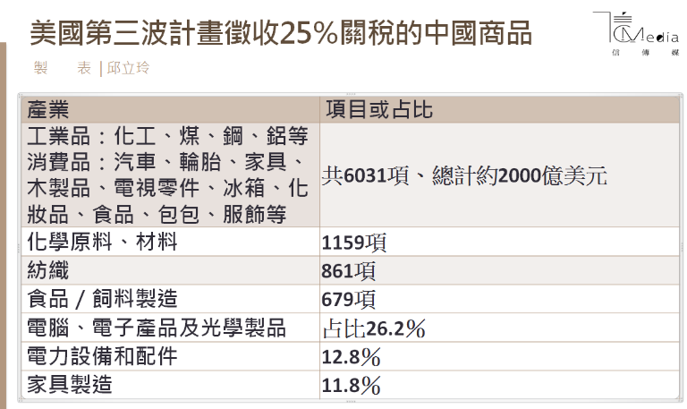在中美互徵500億美元商品的25%關稅後,美國第三波有可能針對2000億美元的6,031項商品加徵關稅,在2017年美國自中國進口金額約5,055億美元佔比39%,這波制裁若真的實施,對中國的打擊不小,不僅可能直接損害中國製造業,還會促使外資企業加速撤出中國市場。