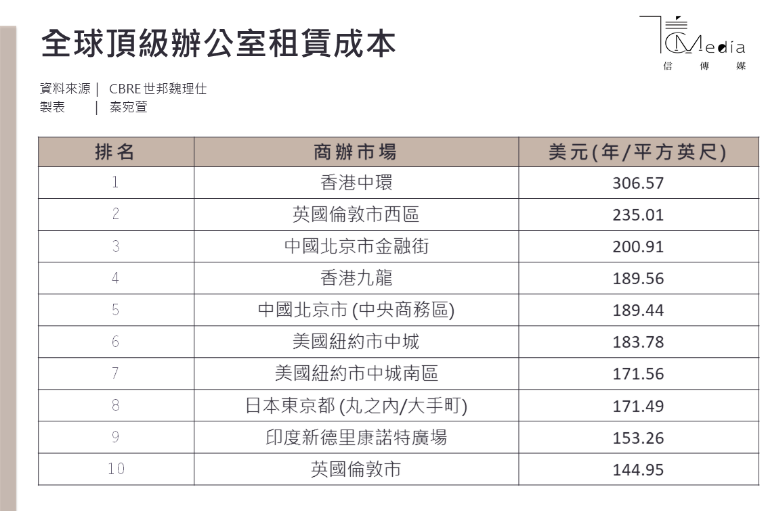 香港商辦租金貴早已不是新聞,根據香港經濟日報報導指出,外資機構租用長江中心一層樓折合台幣每坪約31700元,創下中環商廈歷來最高紀錄,並按照比例計算,這家外資機構租長江中心45樓全層,每月租金高達新台幣1783萬元。但也有不少企業不堪昂貴租金,紛紛退出中環、金鐘與上環等核心區域,找尋較便宜的辦公地點,甚至還傳出有些集團考慮成本問題,計畫退出香港。