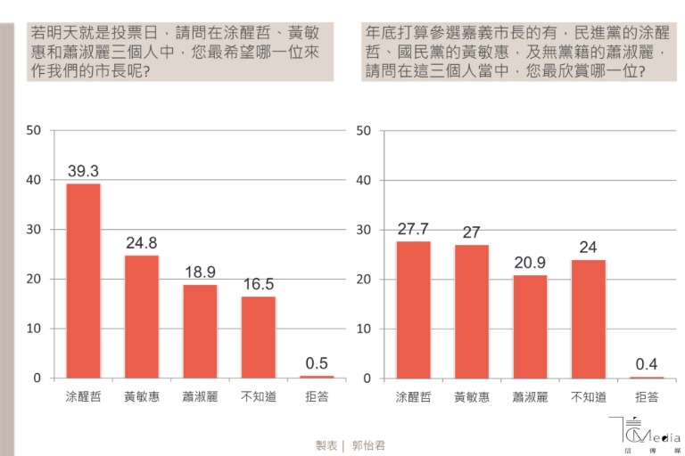 根據《信傳媒》最新民調,嘉義市確實如外界預判,各有各的盤勢。支持度方面,39.3%選民希望涂醒哲擔任下屆市長,優於黃敏惠的24.8%與蕭淑麗的18.9%,黃、蕭合計為43.7%,若扣除各自不支持對方的比例,藍綠版圖在嘉義市仍延續傳統五五波的態勢。
