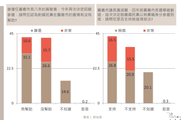 至於蕭淑麗,4年前市長選舉被勸退,這次提名又沒有她,因此決定退出國民黨,以無黨籍身分出戰,民調詢問受訪者是否支持蕭淑麗的做法,43.3%表示支持,36.4%不支持,支持的要高於不支持。這樣的結果,也顯示國民黨曾在內鬨縣市進行整合,但在嘉義市卻徒勞無功,甚至蕭淑麗要被棄保也不容易,畢竟她也有相當的支持者。