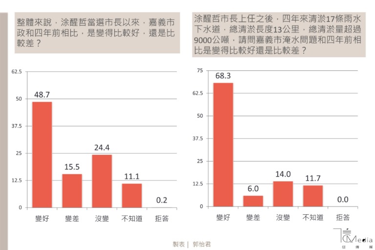 而這次823豪大雨水淹南台灣,嘉義市並未發現嚴重水患,涂醒哲也以整治雨水下水道來喚醒選民記憶,蔡英文總統及閣揆賴清德對此也讚不絕口。在涂醒哲清淤17條下水道,長度13公里,總清淤量超過9000公噸,高達68.3%受訪者認為,嘉義市淹水問題比起4年前要好,變得比較差的僅6%,14%認為沒有改變,這樣的比例,顯然也有一些泛藍支持者沒有否定涂醒哲的功勞。