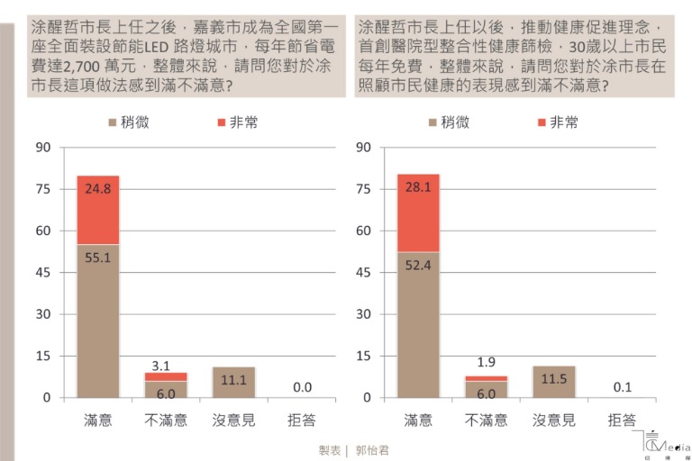 再者,涂醒哲的醫師背景,上任時強調要打造醫療進步城市,因此他首創醫院型整合性健康篩檢,30歲以上市民每年免費。該項照顧市民健康的政策措施,高達80.6%受訪者感到滿意,不滿意的只有7.9%,顯示涂醒哲可以在醫療、長照方面多所著墨,因為這方面的施政頗受好評。