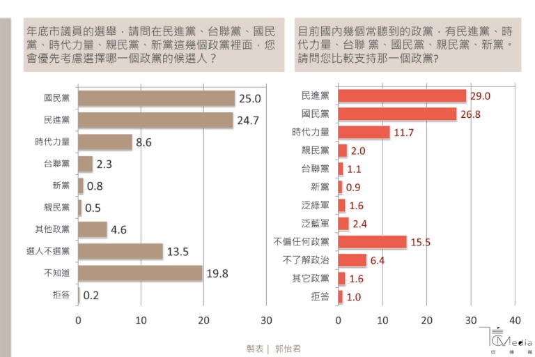市長之外,議員選情部分,民調顯示,25%受訪者會支持國民黨候選人,24.7%支持民進黨,時代力量有8.6%,台聯黨有2.3%,顯然國、民兩黨的競爭是相當激烈,時代力量則有希望在嘉義市插旗。至於也是一股力量的無黨籍,會否藉著蕭淑麗參選的順風,對藍綠構成壓力,值得觀察。