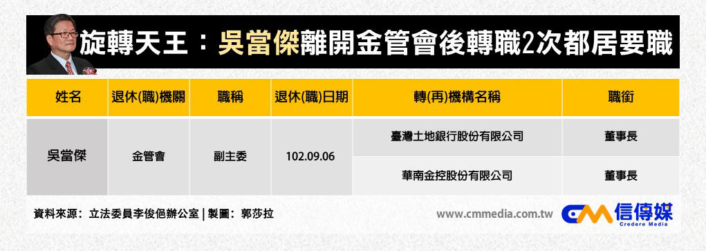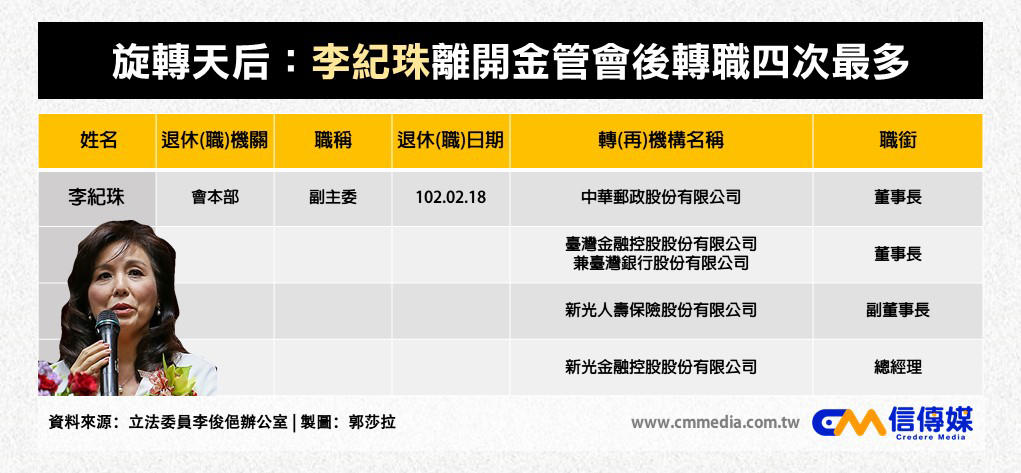 例如,前金管會副主委李紀珠在卸任之後,先到中華郵政、台灣銀行擔任董事長,之後再轉任新光人壽副董事長、新光金控總經理;近日才上任的華南金控董事長吳當傑,也是先到公股行庫土地銀行過水,而他原本的職位是財政部次長,也曾是金管會副主委。