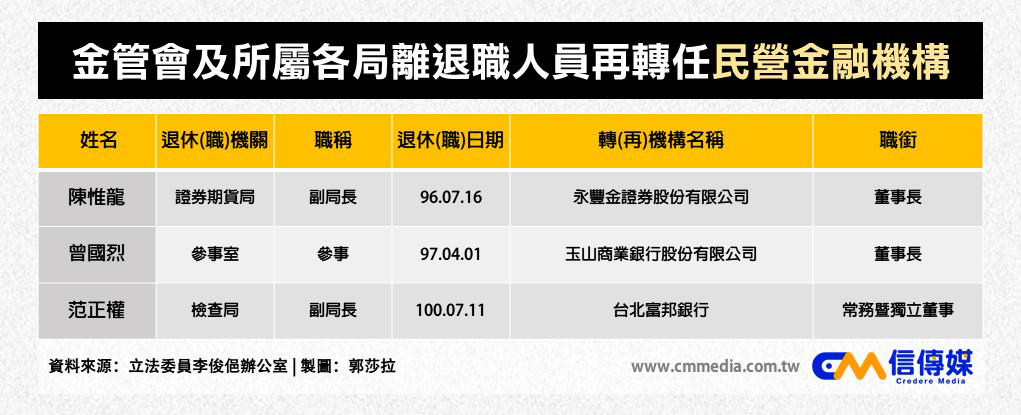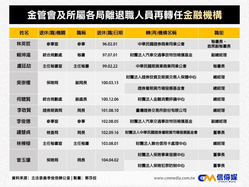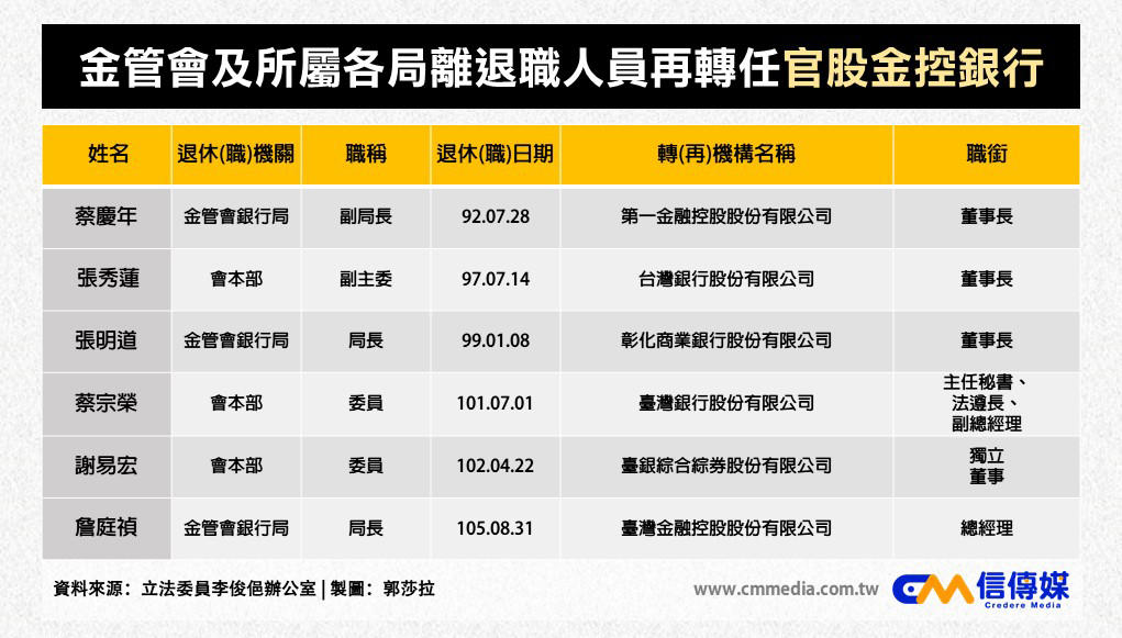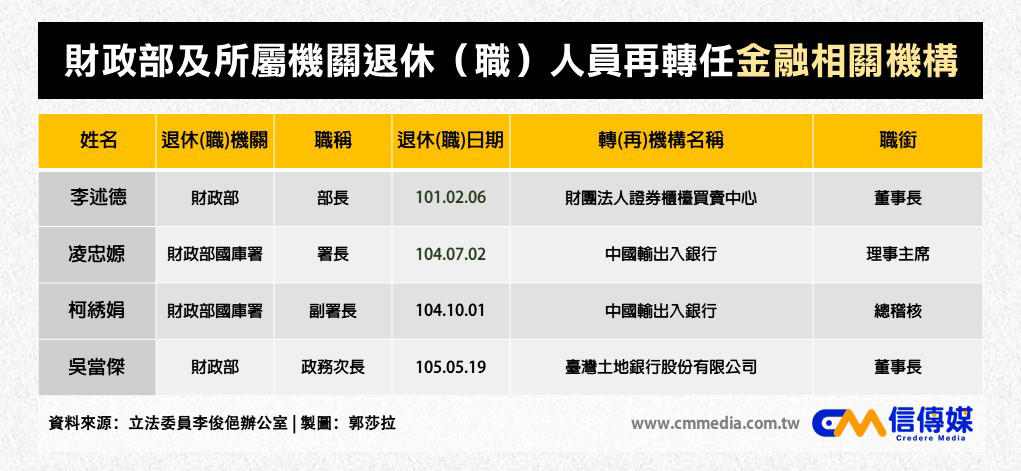 李俊俋整理財政部、金管會資料,發現35位卸任後轉任金融機構的官員中,有高達25位是副局長、副署長以上的政府高官。