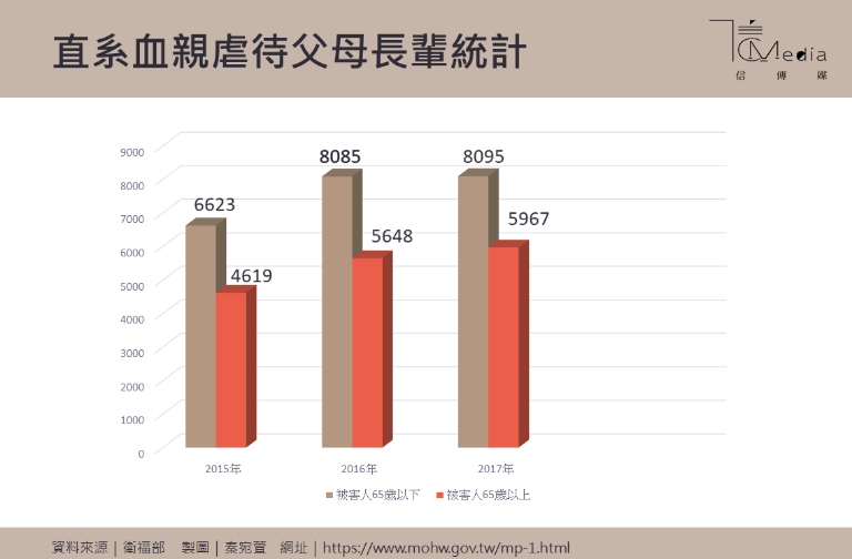 自2015年開始,65歲以上以及以下的父母長輩被虐待有增長的趨勢,衛福部保護司司長林維言推估,可能與台灣邁入高齡化社會後的長期照護、失智症等有關,加上現今小家庭多,照顧高齡者的壓力提升,當家庭支持力不多時,家庭關係就會變得脆弱而出現危機。