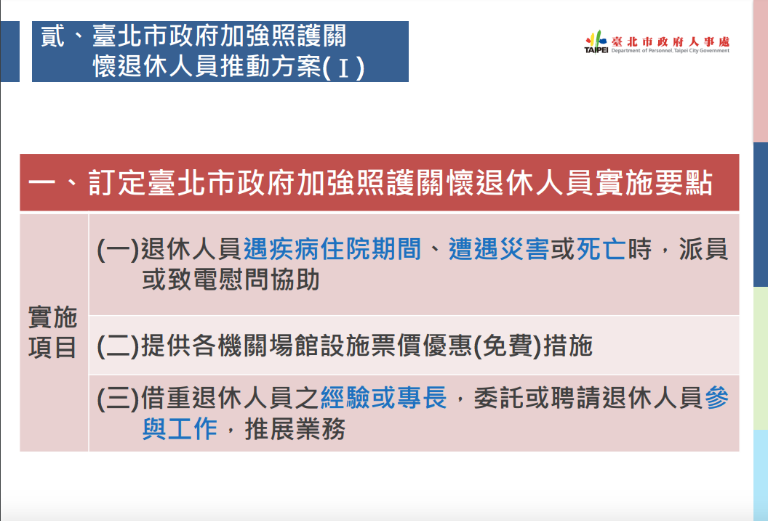 這次座談會僅談到草案的主要項目,並未討論到細節,且市府鼓勵退休人士能夠對政策的執行或是另需擴增的服務項目提出建議,目前所構思的主要機制包括對於退休人員表達出更積極的關懷、讓他們在設施、場館方面能有更多的使用優惠以及針對退休公務人員的人力運用計畫等。