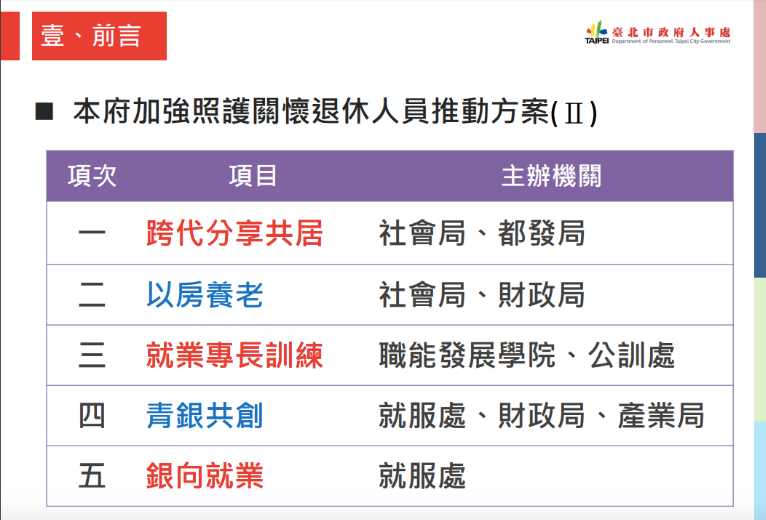 除了以上措施外,北市政府於此座談會也發表針對房屋利用、就業技能提升的計畫,包括跨代分享共居、以房養老、就業專長訓練、青銀共創和銀向就業。房屋利用的相關方案內容,是想憑藉退休人士現有的房產來增加收入,同時,也希望能藉此回應社會上的租屋需求,而台北市政府以媒介的身份,來保障退休公務人員作為房東的權利,減少租屋糾紛的擔憂,以此鼓勵出租空房。另外,就業技能提升的方案中,主要為推廣並普及職能訓練、課程及廣設講座,目的是希望增加退休公務人員的收入來源。