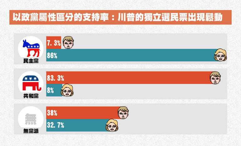 在上周一舉行的辯論會當中,希拉蕊顯然在事先做了十足的準備,不但整場表現的從容不迫,還設了許多陷阱讓川普自亂陣腳。根據ABC新聞網在辯論會結束後所作的即時調查,有53%的受訪者認為希拉蕊表現較優,而川普獲得的支持率則只有18%,更糟糕的是,即便是共和黨的選民也只有45%相信川普贏得了辯論,另外原本較為支持川普的獨立選民認為川普獲勝的比率更是只有14%左右,這恐怕將為川普的選情帶來一大危機。