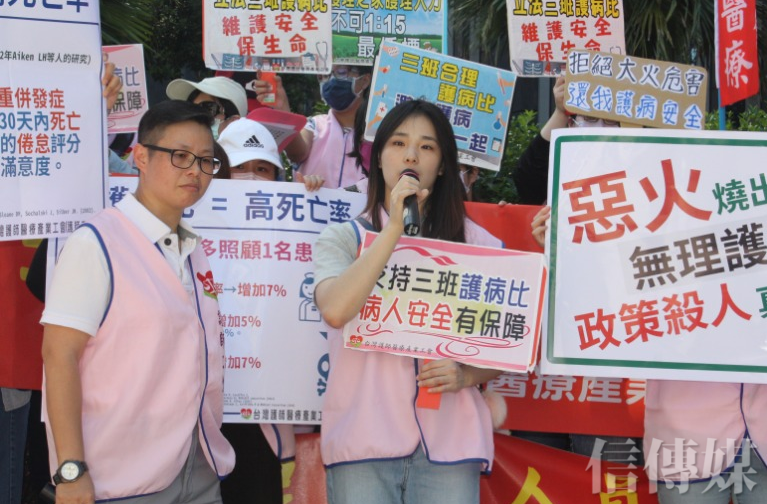 照護司司長蔡淑鳳也表示,護病比目前已納入《醫療機構設置標準》,預計今年完成立法,關於三班合理護病比機制,她表示會朝此方向努力。