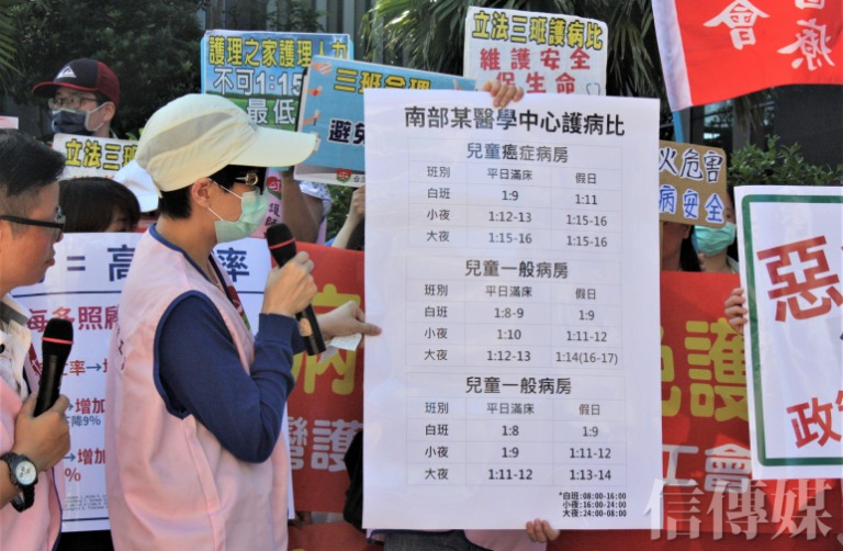 來自南部醫學中心兒童癌症病房的許姓護理師也表示,目前兒癌病房現況,白班平日是1:9、假日是1:11、小夜班1:12-13、大夜平日跟假日都是1:15-16。一般病房則是白班平日1:8-9、假日1:9、小夜1:10,兒童一般病房假日大夜1:14,「偶爾還會到1:16-17」三班時間分別為白班08-16:00、小夜16-24:00、大夜24-08:00。陳玉鳳表示,目前政府規定在醫學中心要求護病比是1:9,可是是用全日去算平均,如果分三班來看並沒有達到1:9。