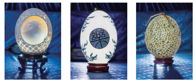 「蛋雕不是成功就是失敗。」關椿邁說,當耗費數月, 最後一刻卻不慎滑刀、蛋殼上出現裂隙,整個作品便前功盡棄,因此每次下刀都如履薄冰。為作品命名也饒富趣味:用鴕鳥蛋雕鑿出的「哈密瓜」, 蛋中蛋、每面皆有一隻牛的「牛轉乾坤」,兩條鯉魚加上一個歪斜「樂」字 的「魚水之歡」,以及使用數量受澳洲 政府管制的鴯鶓蛋雕出的「愛蓮說」, 更顯殊勝。