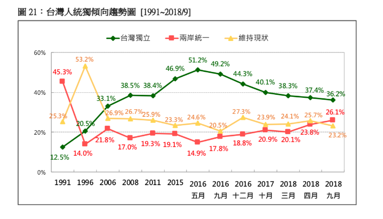 此外,民調也針對選民對未來兩岸狀況的想像做調查,發現支持台灣獨立的選民在綠營執政下比例越來越低,反而在前總統馬英九執政下,台獨趨勢越來越高,在蔡英文2016年當選總統時達到最高峰。