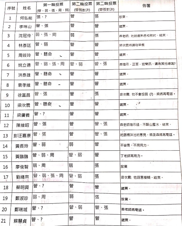 台大教授分析,這應該是遴選較前期的資料,根據表格顯示,「佈署」一欄,管陣營估計鐵票有8張,這8人所有第一輪的選擇都有管,反證這是管營的資料;而在「第一輪投票」一欄裡,有4人的第二個選擇是「聽命」,也就是等待採取集體行動的意思,這時還沒決定集體投票的第二張要給誰。