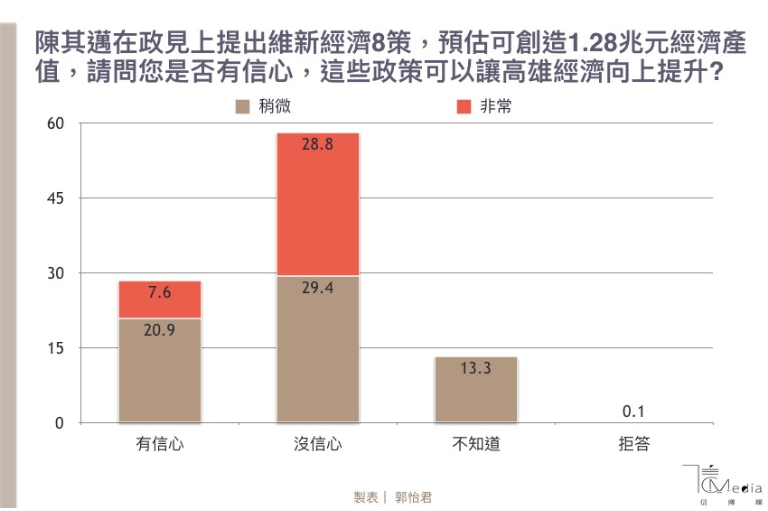 綠營在高雄已連續執政20年,雖然慢慢改善了資源分配不均的城鄉差距,但近經濟發展相對遲緩,沒有合適的工作機會,也留不住年輕人。《信傳媒》民調顯示,有高達58.1%的選民對陳其邁提出的經濟政策沒有信心,僅70歲以上的選民較相信陳其邁能提升高雄經濟。事實上,就連政黨理念屬於民進黨的選民,也有26.2%沒信心,而軍公教更是高達79.3%,其中認為高雄市有進步的選民,也僅44.8%對陳其邁有信心,41.0%沒信心。