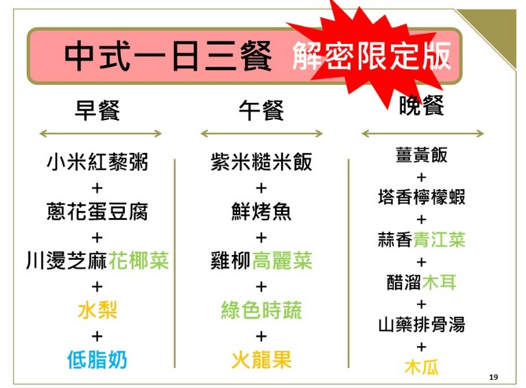 楊蕓菁表示,均衡食物(Balance diet)泛指每日由飲食中獲得身體足夠所需的各種營養素及能量,要依照個人年齡、性別和活動強度,參考每日飲食指南建議,找到合適的熱量需求及建議份數,並提醒民眾要以「膳食多樣化」確保身體健康、遠離疾病風險。