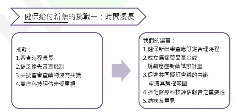 1.審查時程漫長:根據和信醫院藥劑科主任陳昭姿統計,與一般新藥平均需要380天相比,癌症新藥納入健保給付平均需要711天,顯然現在的癌症新藥納保時間相對冗長,健保署在癌症新藥審查的過程中未訂定合理時程。