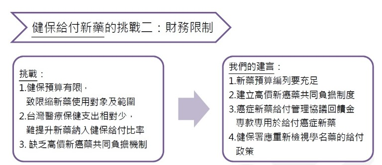 癌症基金會也提出健保給付新藥的建言,包括:政府應成立癌症藥品基金或規劃癌症新藥試辦計畫、強化醫療科技評估、建立高價新癌藥共同負擔制度等,並呼籲健保署應重新檢視學名藥的給付政策。