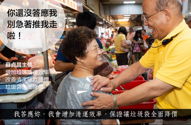 蘇貞昌的臉書放了三張自嘲圖,如蘇貞昌正拍著民眾的肩,說「我答應你,我會增加清運效率,保證讓垃圾袋全面降價」,民眾則說「你還沒答應我別急著推我走拉!」或是,有阿嬤說「你拍這麼大力我假牙會掉下來拉」,蘇貞昌則承諾「沒關係,我當市長,市府免費幫你裝假牙。」