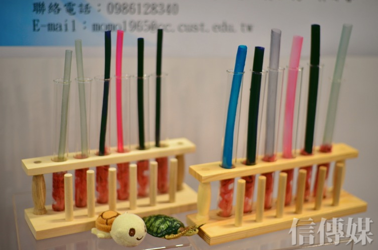 「我們嘗試過很多種材質,最後選定了這種海藻萃取物做成的吸管,為了成形,也失敗了n次,才讓大家看到目前的成果。」吳崇仁解釋說,海藻做成的吸管和目前的環保紙吸管比起來成本便宜一大半,紙吸管一根大約5元上下,海藻吸管頂多是目前塑膠吸管的3倍上下,它可以被吃進肚子裡面去,會被分解,如果丟進還原液,一天之內就會恢復凝膠的狀態。