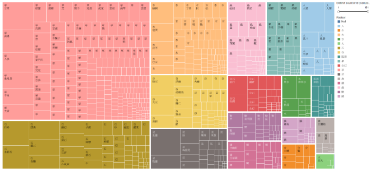 洪暉鈞展示方塊圖資料庫解釋,「方塊圖以數十個大大小小的部首呈現,數量最大的部首是草,接下來依序是石、木、蟲、人,而人尿就歸屬人這個部首,其複方對應的症狀為一切風疾、人咬手指、及大便不通等。」而蟲部首排名第一的是蚯蚓,可以治療口舌糜瘡、小兒尿閉、小兒急驚及小便不通等;至於果部首排名第一的檳榔,竟可以治療口吻生瘡、大小便、大腸患秘、小兒頭瘡等症狀。更特別的還有,屬於服器部首的麻鞋、草鞋、布、衣帶、絹、紙、頭巾及尿桶等藥材,讓人難以理解為何可以入藥。