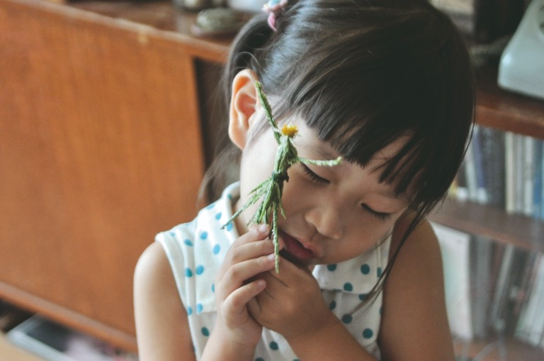 前陣子回鄉下老家,走在滿是野草的小路上,眼見長柄菊隨風搖曳,想起兒時那些把玩花草的小小趣味!摘了一點下來,簡單編綁,他們搖身一變,成了可愛的小花人偶,我拿給兒子女兒玩,孩子臉上滿是驚奇,想必這是身邊充滿塑膠玩具的他們,不甚熟悉的觸感,但人天生屬於自然,孩子不一會兒就玩得直說:「媽媽,再幫我做一隻!」