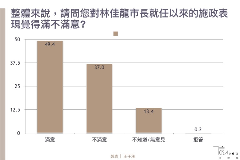 專心市政的林佳龍,有49.4%選民滿意他的施政,但不滿意和未表態的選民也高達50.5%,也就是說這三年來,施政政績恐怕也不是林佳龍最加分的強項,就連滿意市長施政的選民中,也有11.5%會投給盧秀燕。