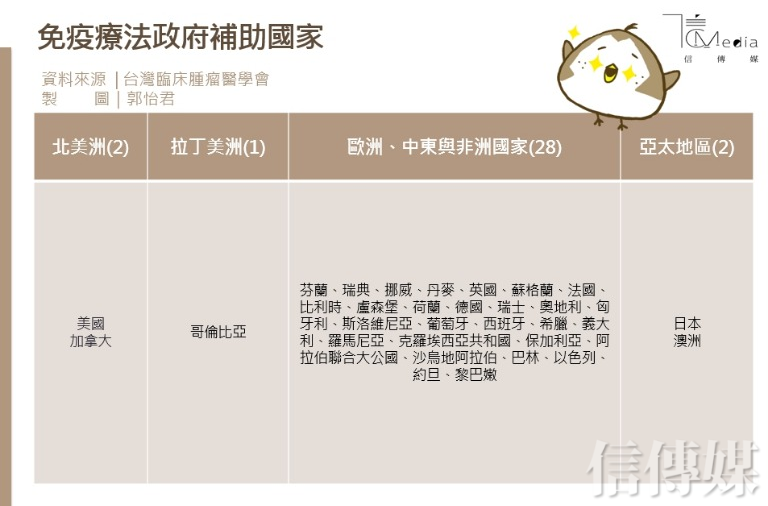 然而,在英國、日本等各國相繼給付免疫療法使用於晚期肺癌第一線治療的同時,台灣病友卻等不到健保給付。陳育民表示,目前全球有33個國家給付免疫療法,英國、加拿大、澳洲、日本等先進國家也相繼給付,且是第一線就給付,「台灣雖然免疫療法已到位,但健保在免疫療法的給付腳步上,卻落後其他國家。」
