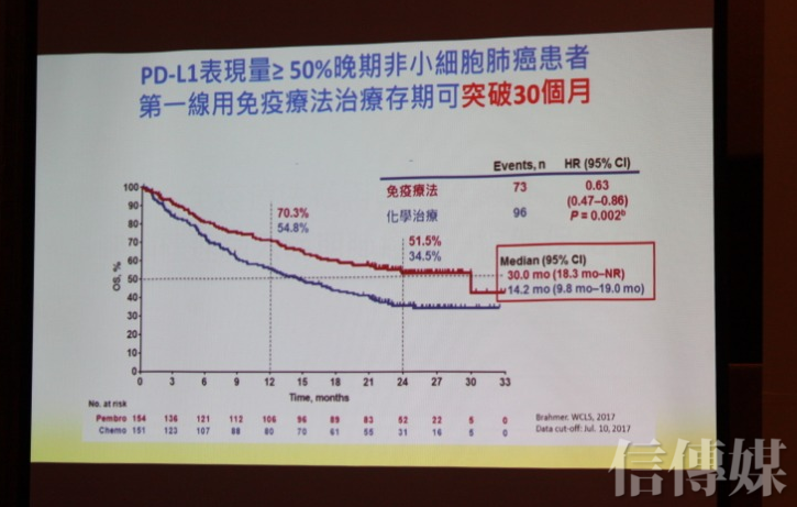 高尚志解釋,「免疫療法可以誘發患者自身的免疫系統來擊退癌細胞,經過化學治療後免疫力會變差、且腫瘤也可能會變異。根據臨床研究顯示,PD-L1高度表現的晚期非小細胞肺癌患者,於第一線接受免疫療法治療後,其中位數存活時間可達30個月,為傳統化療的1倍多,患者最好能在第一線、越早使用免疫療法效果會較好。」