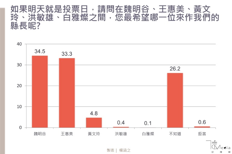 根據《信傳媒》最新民調顯示,在希望由誰擔任下屆彰化縣長的結果中,魏明谷是34.5%,對手國民黨候選人王惠美33.3%,兩人呈現五五波,勢均力敵。