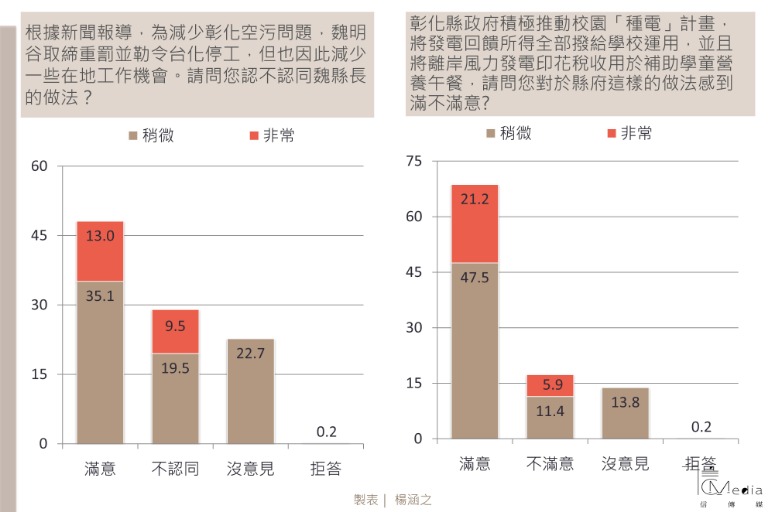 民調調查了幾個魏明谷的重大施政,包括取締重罰並勒令台化停工,雖然因此減少一些在地工作機會,但卻有48.1%選民認同。另外,積極推動校園「種電」計畫,將發電回饋所得全部撥給學校運用,並且將離岸風力發電印花稅收用於補助學童營養午餐,也獲得68.7%的滿意度。然而,經過交叉分析顯示,大多數選民雖然認同彰化縣政府的新政,但這群人之中約有2成5左右還是支持王惠美。