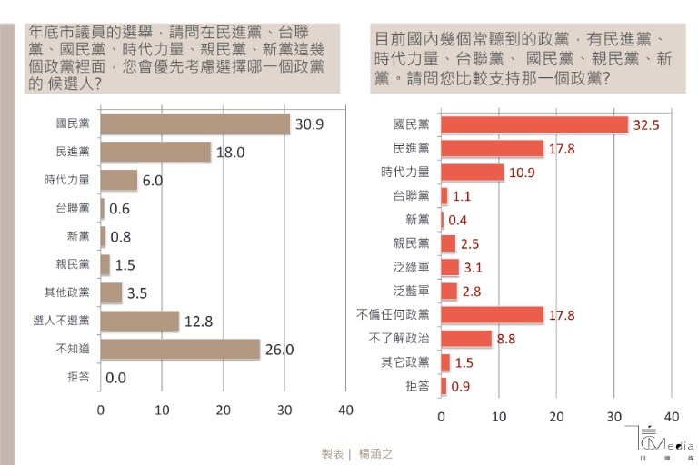 值得一提的是,時代力量支持者中,卻也有14.2%支持無黨籍候選人黃文玲,而24.8%尚未決定意向。對魏明谷來說,中間選民或是隱性支持者的部分,是他可以再加把勁催下去的族群,如何強化政績宣傳,是他爭取這些選民支持的重點。
