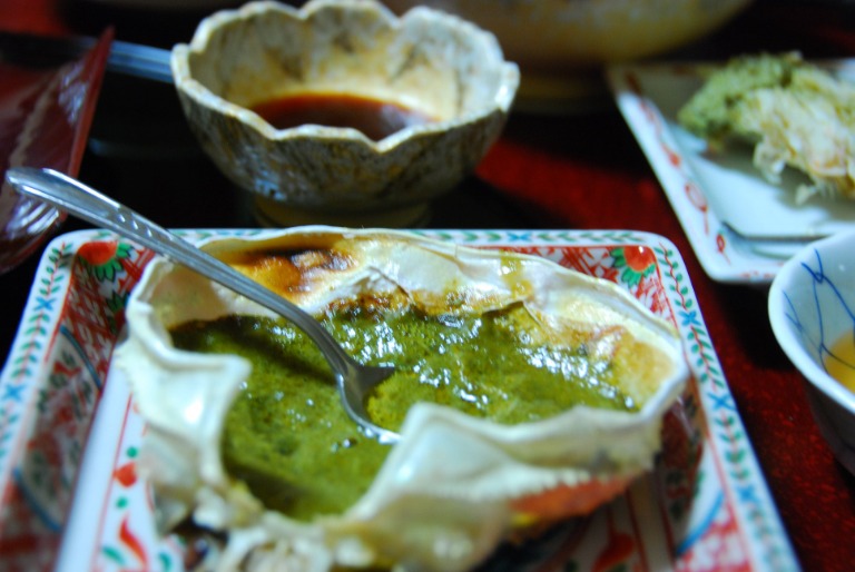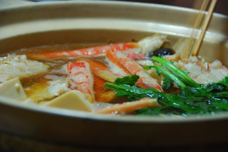 松葉蟹最道地的吃法是一人一隻,先嚐蟹膏、再嚐蟹肉沙西米,之後用冷蟹與炭烤蟹腳;火鍋呢,則是先將蟹腳放進去涮,品嚐後再把蔬菜與蟹身放入一起煮,最後將食材撈起用高湯煮雜炊粥作結尾,也就是一蟹六吃:蟹膏、沙西米、冷蟹、炭烤、火鍋與雜炊粥等六道吃法。服務生會一道道幫客人料理,不會像中秋烤肉般地手忙腳亂。由於旅館就在產地旁,加上服務生當場幫客人服務,所以比起那些在日本大都市的螃蟹連鎖店,我只能說好吃一百倍。