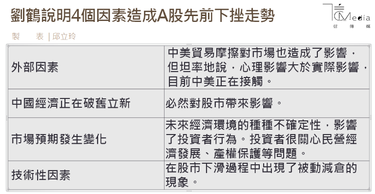 但是,中國官媒上週五發布副總理劉鶴的受訪稿,對A股具有激勵作用,過去3個多月一路下滑的A股掃去陰霾。據信,在劉鶴操刀下,國家隊疑似有進場拉抬權值股,19日午後陸股突然拉高強彈,上證指數收盤跳漲2.6%,到了本週一(22日)盤中又大漲4.2%至2656.87點,深圳成指大漲5%至7760.08點,深圳創業板更猛,暴漲超過6%。