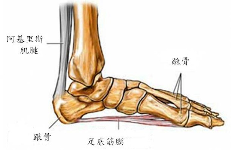 我們的足底,從每個腳趾頭有筋膜往後延伸,最後匯集到跟骨處 (圖1),就是所謂的足底筋膜。此筋膜的作用主要是支撐足弓,增進足踝的穏定性,並減輕外力對足部的衝擊。由於過度或不當的使用,造成足底筋膜的發炎、勞損或裂傷,統稱為「足底筋膜炎」。雖然名稱有「炎」,但根據病理的研究,發炎的情況並不多見,絕大多數是筋膜的變性、勞損,甚至撕裂傷。