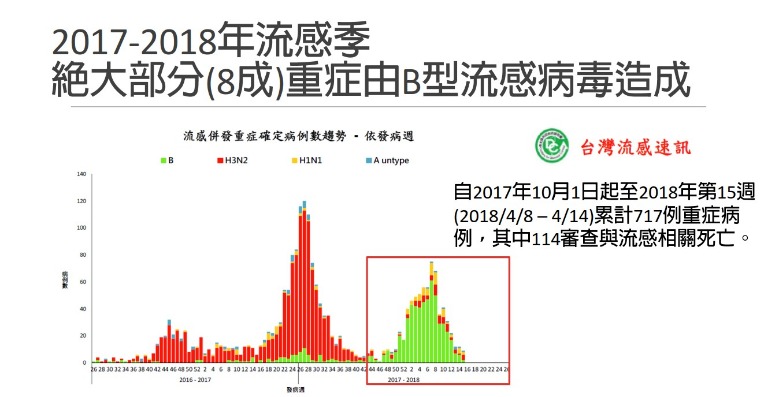 不過,呂俊毅指出,民眾對B型流感較為忽視,但以過去衛福部的統計資料來看,2011至2012、2017至2018年流感季B型流感盛行率甚至高於A型,「在2017至2018年,8成重症是由B型流感造成的,且兒童患B型流感住院比例、變重症的機率都較高!」